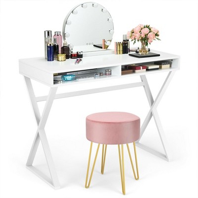 Costway Vanity Table Set Writing Desk Makeup Table w/Round Velvet Ottoman Pink
